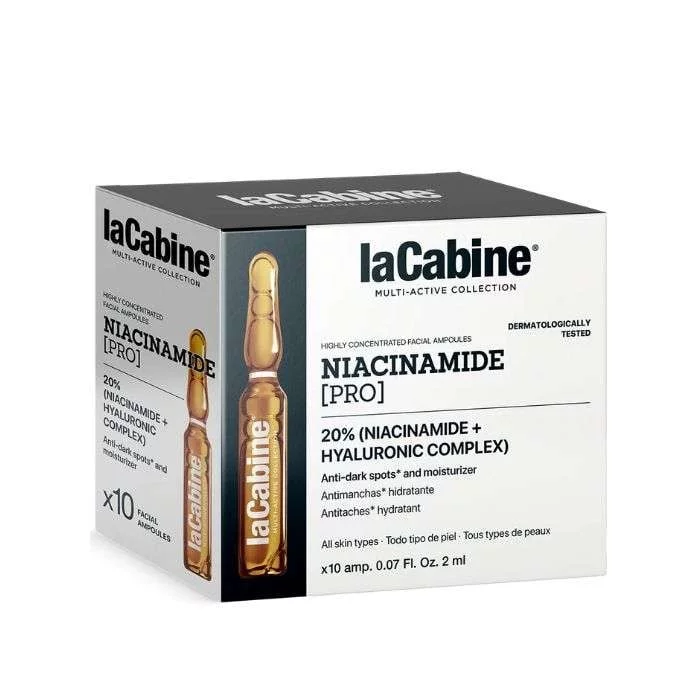 LA CABINE Ampoules Niacinamide 20% Pro – Cure Anti-Taches & Perfection du Teint Les Ampoules Niacinamide 20% Pro de LA CABINE sont un traitement intensif conçu pour corriger les taches pigmentaires, améliorer la texture de la peau et restaurer son éclat. Grâce à leur forte concentration en niacinamide (vitamine B3) associée à trois types d’acide hyaluronique, elles agissent en profondeur pour un teint plus uniforme, lisse et lumineux. Cette cure de 10 jours cible efficacement l’hyperpigmentation, les pores visibles et le teint irrégulier, tout en apportant une hydratation intense pour préserver le confort cutané. Les bienfaits des ampoules Niacinamide 20% Pro ✔ Réduit visiblement les taches pigmentaires et marques d’acné ✔ Unifie et illumine le teint ✔ Affine le grain de peau et minimise les pores ✔ Hydrate intensément grâce à l’acide hyaluronique ✔ Texture légère, fraîche et non grasse Pour qui ? • Peaux ternes ou irrégulières • Taches pigmentaires et post-acné • Pores visibles et texture irrégulière • Tous types de peau Conseils d’utilisation Appliquer 1 ampoule par jour sur peau propre, matin ou soir. Masser le visage et le cou jusqu’à absorption complète. Utiliser en cure intensive de 10 jours pour des résultats optimaux.