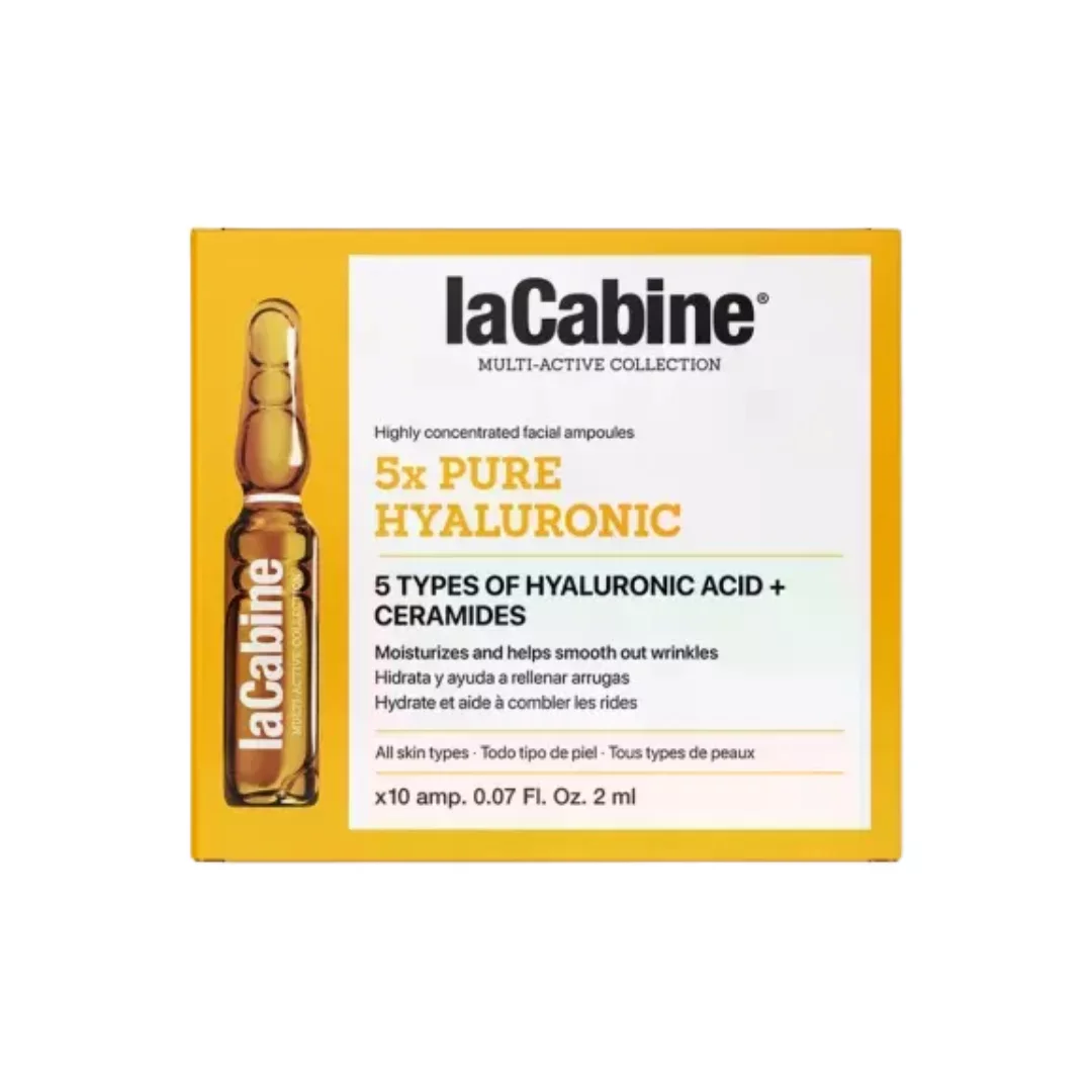 LaCabine 5x Pure Hyaluronic Ampoules – Hydratation Intense & Effet Repulpant (10 ampoules) Les ampoules LaCabine 5x Pure Hyaluronic sont un soin concentré conçu pour hydrater intensément, combler les rides et redonner du volume à la peau. Leur formule avancée associe 5 types d’acide hyaluronique, des céramides et une technologie de phospholipides pour une efficacité renforcée et une pénétration optimale des actifs. Ces ampoules agissent pour repulper la peau, améliorer son élasticité, renforcer la barrière cutanée et lisser les rides, laissant le teint plus frais, lumineux et visiblement rajeuni. Leur format monodose garantit une application précise, hygiénique et adaptée à une routine quotidienne. Convient à tous les types de peau, même déshydratées ou fatiguées. ✔ Hydratation profonde et effet repulpant immédiat ✔ Comble rides et ridules ✔ Renforce la barrière cutanée ✔ Format ampoule pratique et hygiénique Conseils d’utilisation Appliquer le contenu d’une ampoule sur le visage et le décolleté propres, masser jusqu’à absorption complète, puis appliquer votre soin habituel.